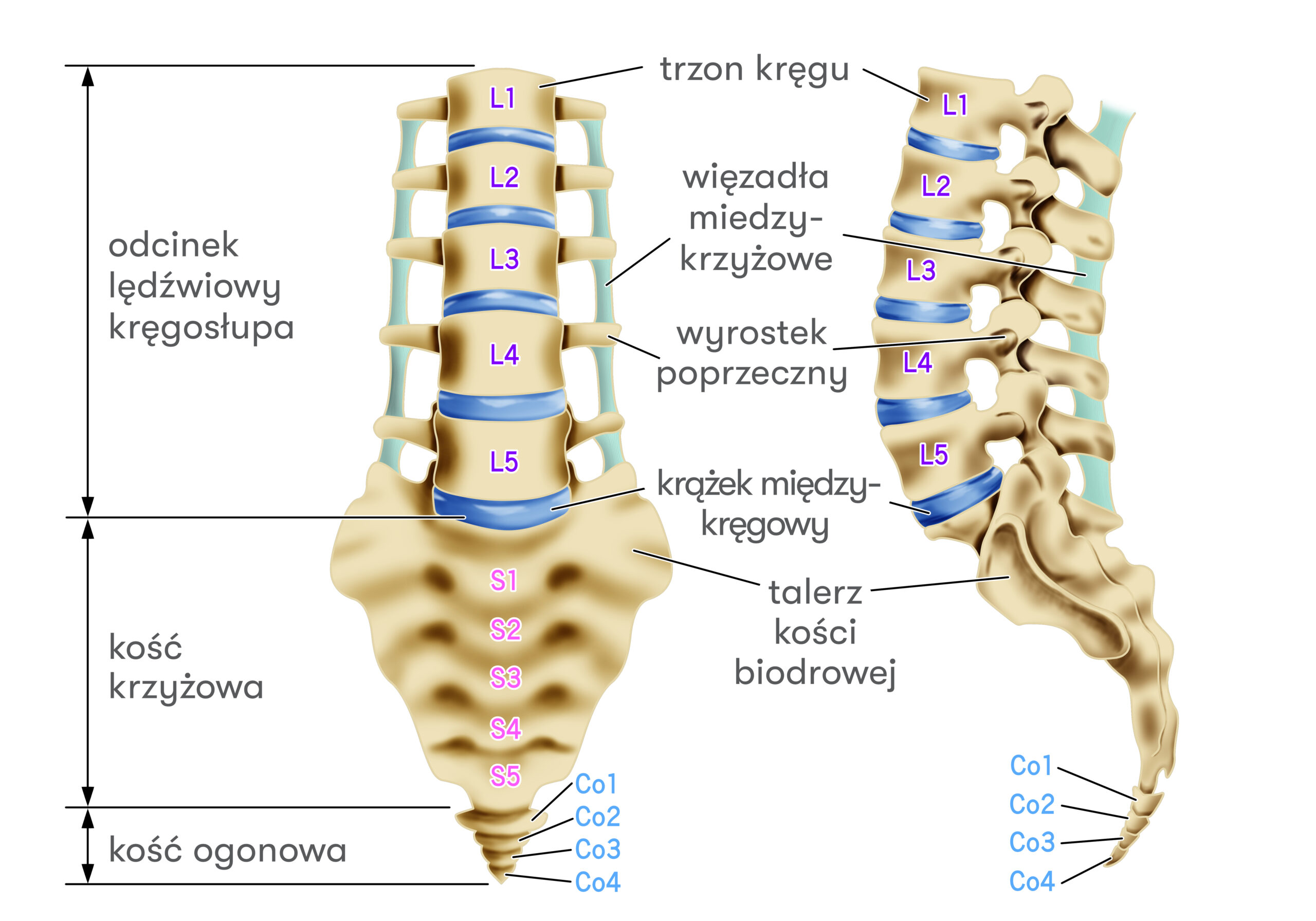 Odcinek krzyżowy składa się z 5 kręgów zrośniętych ze sobą w jedną kość (os sacrum).