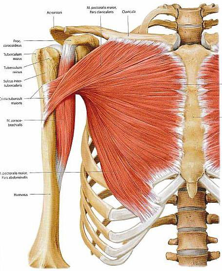 Szeroki, płaski mięsień. Znajduje się między mostkiem, kością ramienną i obojczykiem.